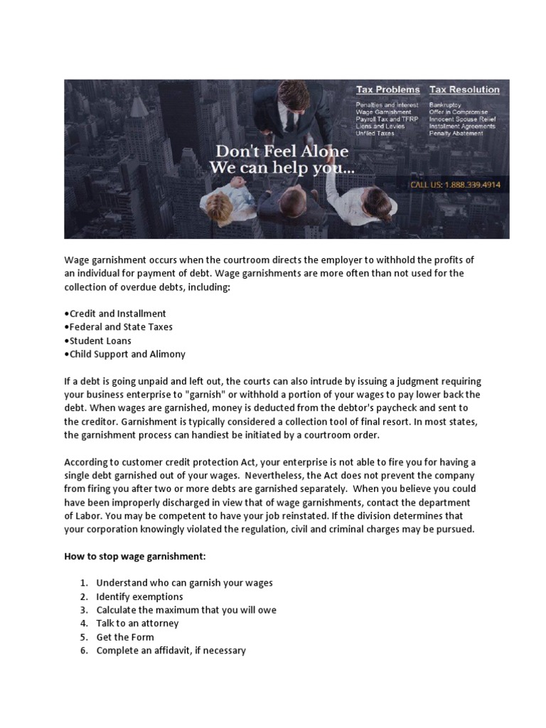 Take into consideration exploring debt debt consolidation or resolution options to relieve your monetary problem and potentially quit potential wage garnishments. Working with a credible financial debt comfort agency can aid you bargain lower rate of interest fees or reduced repayment volumes with your financial institutions.